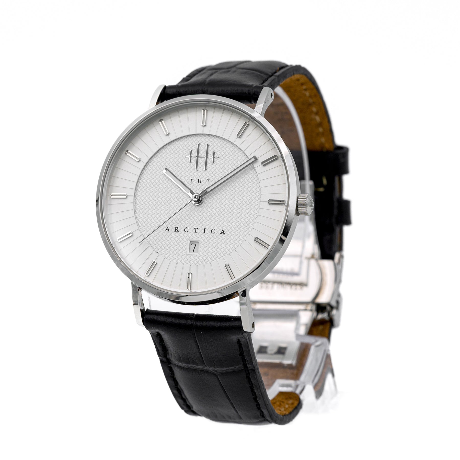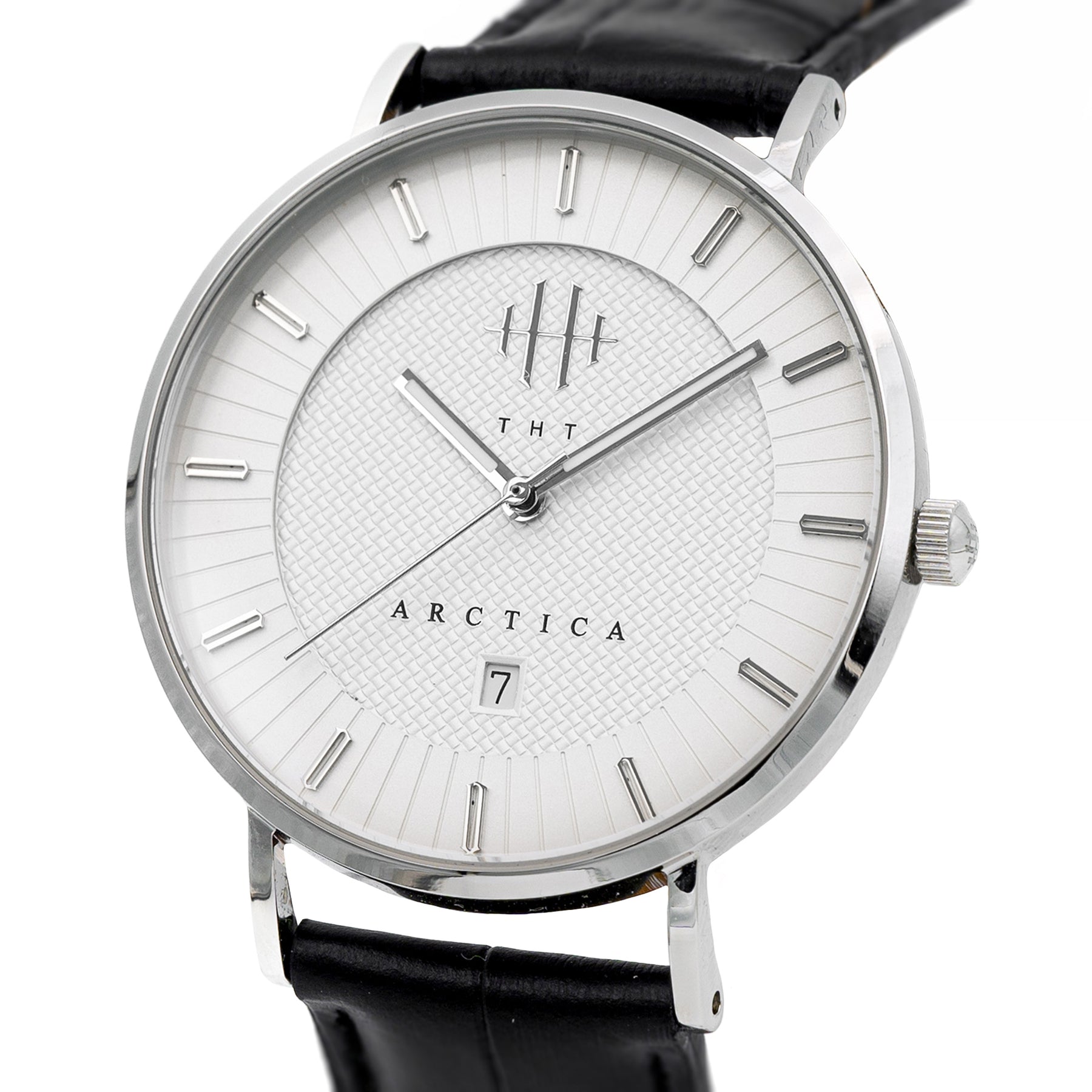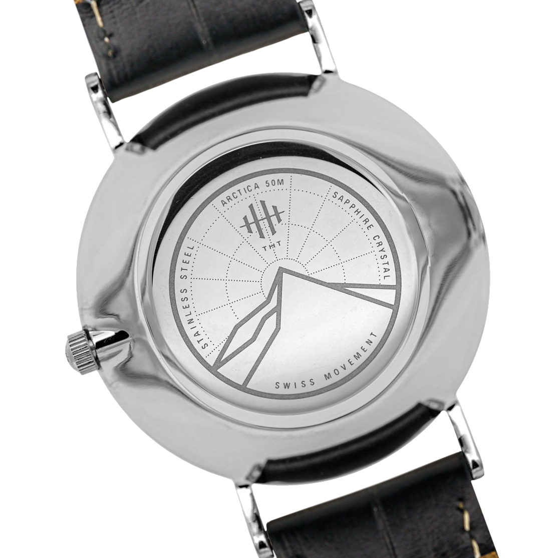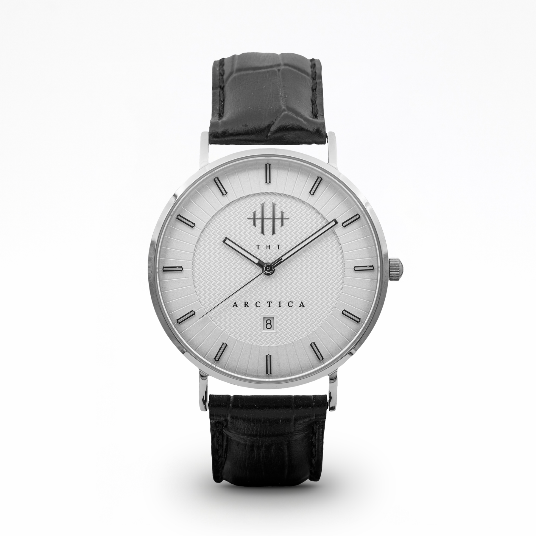 THT Watches Arctica Big Baller. Black and white watch for men with silver hands and leather strap.